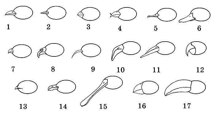 | № 14 | Клювы рыбоядных птиц. Клюв от тонкого заострённого до массивного крючковатого. Клюв прямой, сжат с боков и слегка изогнут на конце. |